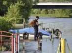 Diese Aufnahme zeigt Hohenschöpping um 1900 von der anderen Seite der Havel. Hier muss einst die Brücke gewesen sein. Am Ufer befindet sich die Verladestelle für Holz, dahinter ein Wirtshaus und schließlich der Gutshof des Fuhrunternehmers Blumberg. Das Landhotel entstand nach 1990 auf dem Gelände des Gutshofes.